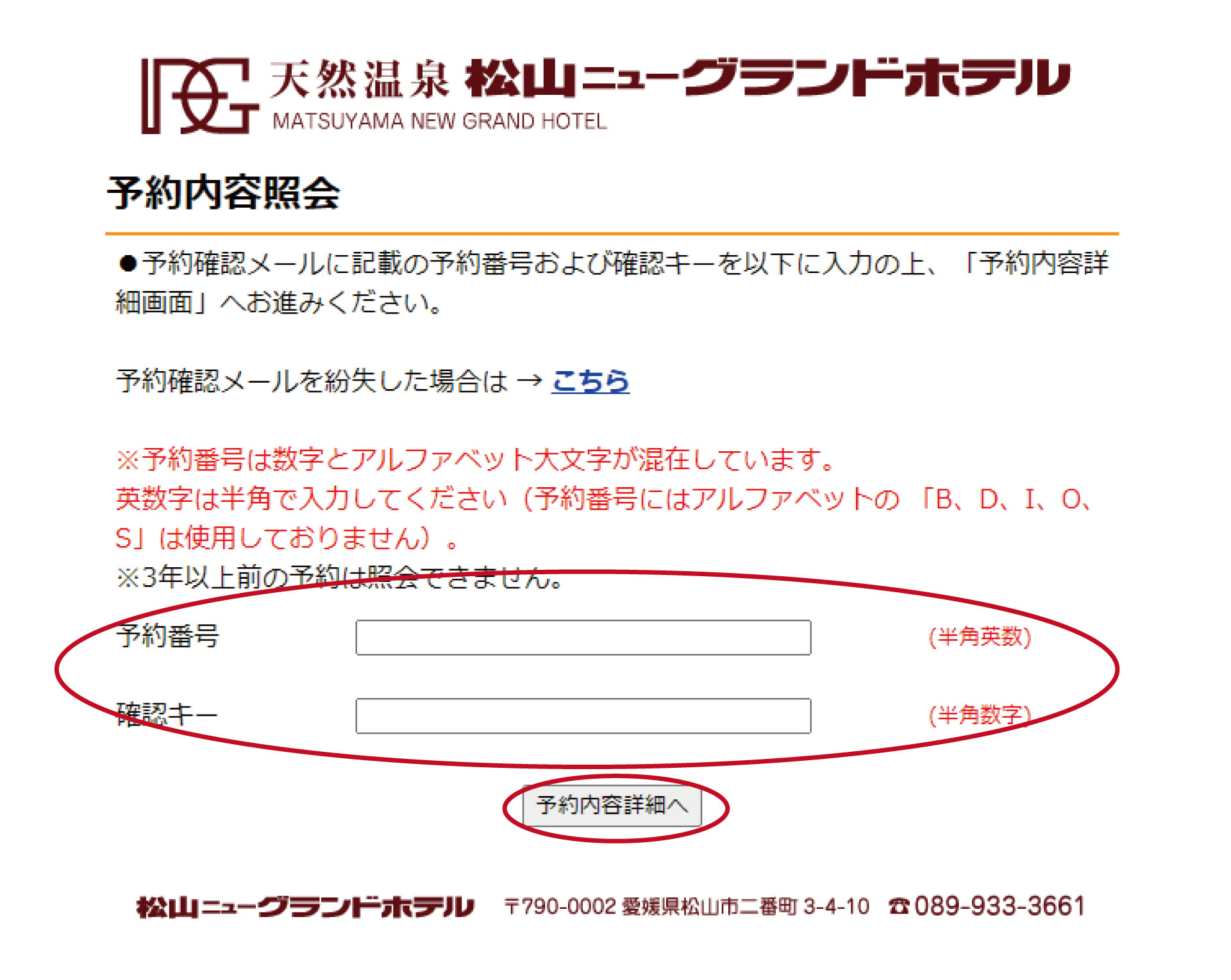 「予約内容照会」画面に予約番号と確認キーを入力する