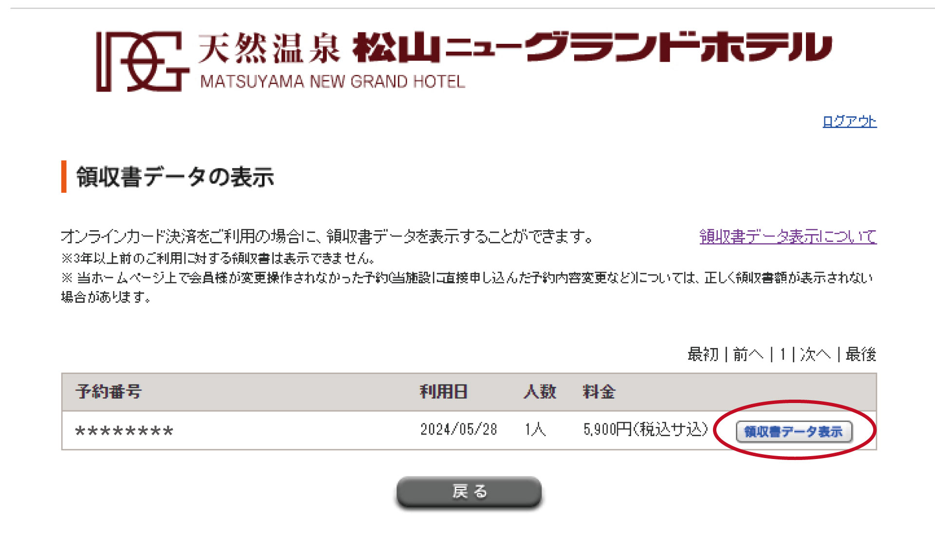 「予約内容詳細」画面の「領収書データ表示」ボタンを押す