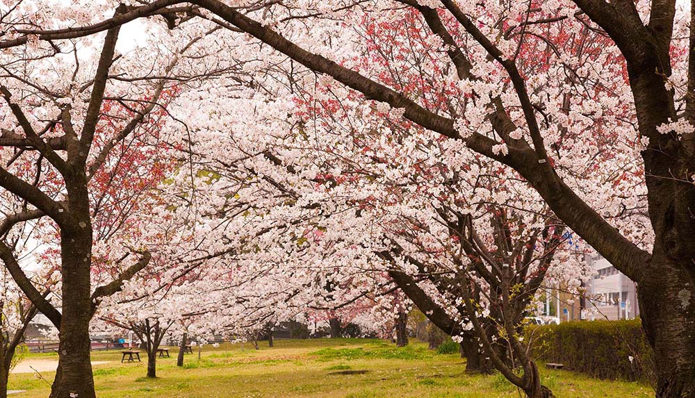 松山市の中心部を流れる石手川沿いにある緑地で、遊具広場やバスケットコート、遊歩道などがある憩いの広場です。春はたくさんの桜が咲き誇り、家族連れやお花見グループで賑わいます。