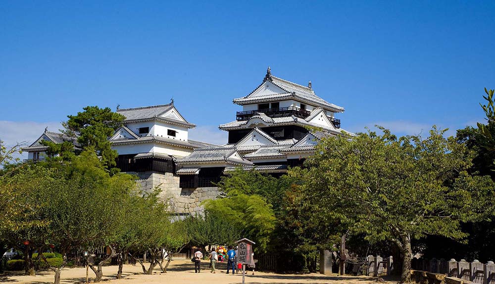 松山市の中心部、勝山(標高132m)にそびえ立つ松山城は松山市のシンボルとして市民に親しまれ、本丸広場は桜の名所で市民の憩いの場となっています。ロープウェイやリフトもあり、天守閣も観光できます。裾野には、二之丸史跡庭園や城山公園があります。