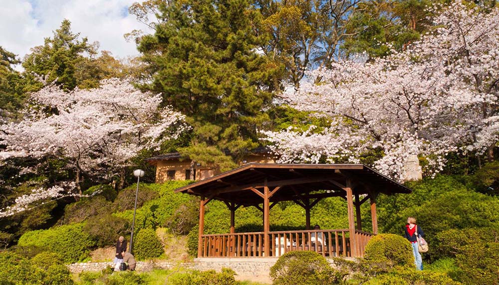 道後温泉のほど近くにある中世の時代に伊予国の守護であった河野氏が本拠地としていた湯築城跡と、その周辺からなる公園です。湯築城跡から出土した猫の足跡がついた土器が話題になりました。春は桜の名所になります。